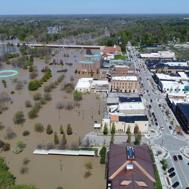 Aerial footage shows Midland, Michigan, inundated with floodwater